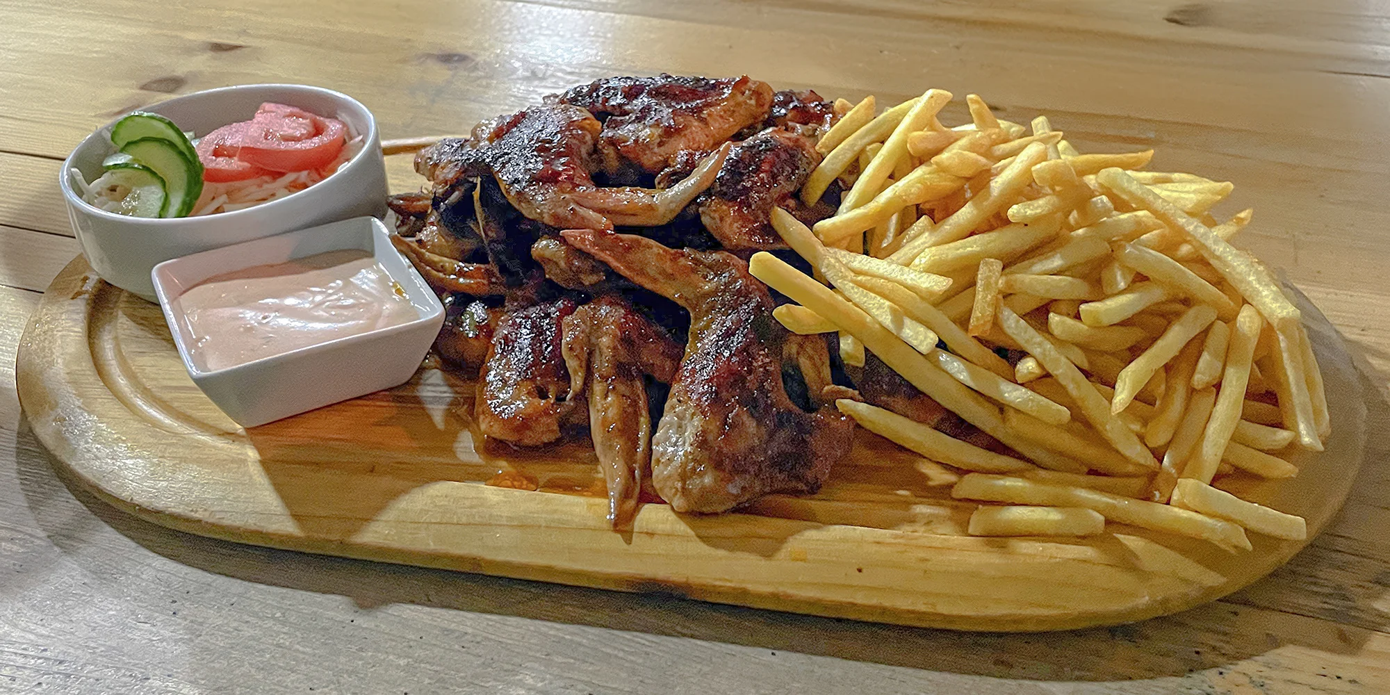 1 či 2 kg BBQ křídel s hranolky, salátem i omáčkou