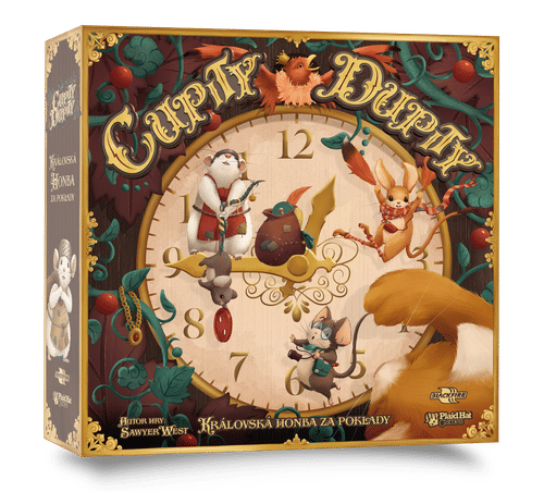 Předrahé myšky a myšáci z Tikovických hodin, Nakruťte si fousky a narovnejte ocásky, neb jste tímto zváni ke Královské honbě za poklady! Seberte své družstvo, prohopsejte se a prošťouchejte ke slávě! ALE, dávejte si taky pozor na svou desku honby za pokladem, protože vám tyto předměty mohou přinést extra body, jakmile hodiny odbijí půlnoc! Pro mrňousky tu navíc bude soutěž ve šplhání po řetězu. Celé to začíná v sedm večer, PŘESNĚ. Oděv prosím nenuceně elegantní. Za každou doručenou věc vás bude očekávat chutná krmě ze sladkých bobulek. V Cupity Dupity ovládá každý z hráčů tým myšek, které touží potěšit popletenou ptačí paní, která obývá jejich milované kukačkové hodiny. Cestujte na minutové ručičce kolem hodin a seskakujte v pravou chvíli se svými myškami. Snažte se u toho sebrat co nejvíce pokladů a zaslužte si přízeň Lady Kukačky. Ale pozor! Minutová ručička není dost velká pro všechny myšky a když začne být těsno, někdo musí z kola ven! Obsah balení: 1 deska hodin 1 sada hodinových ručiček 2 záslepky na ručičky 3 postranní desky 4 desky honby 1 sáček 93 akrylových destiček 12 žetonů akčních polí 16 karet myšek 20 dřevěných figurek 25 mini karet 1 desetistěnná kostka 18 žetonů a ukazatelů 2 referenční destičky pravidla hry