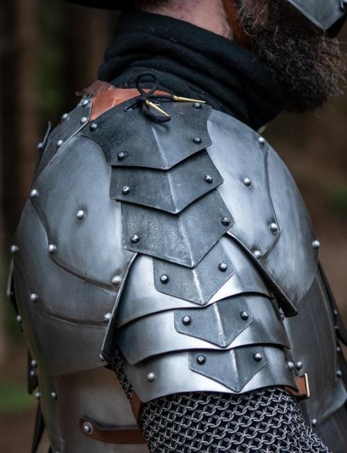 Plátová ramena jsou inspirované zbrojemi severských válečníků a jsou vhodné pro fantasy LARP či divadlo. Chrániče jsou vyrobené z leštěné měkké oceli o tloušťce 1 mm, pomocí šňůrky se přivážou ke zbroji a na spodní straně je kožený řemínek kterým si plátová ramena upevníte okolo ruky. Chrániče jsou dodávány v páru, tedy 2 ks. Rozměry: S/M délka: 37 cm šířka horní části: 48 cm šířka dolní části: 21 cm L/XL/XXL délka: 40 cm šířka horní části: 55 cm šířka dolní části: 23 cm