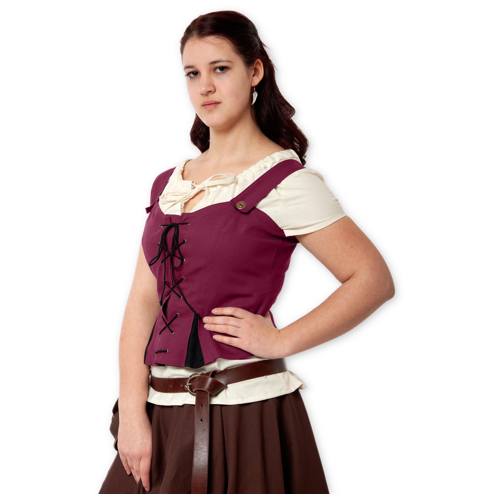 Jednoduchý vypasovaný živůtek ve vínové barvě, opatřený předním i zadním šněrováním. Šikovný doplněk k ženskému kostýmu, který dodá historickému kostýmu šmrnc. S vhodnou blůzou a sukní vytvoříte parádní komplet na jakoukoli akci. Pro příjemné nošení je živůtek vypodšívkovaný bavlněným plátnem. Více o použitém materiálu se dočtete zde: popis materiálů.